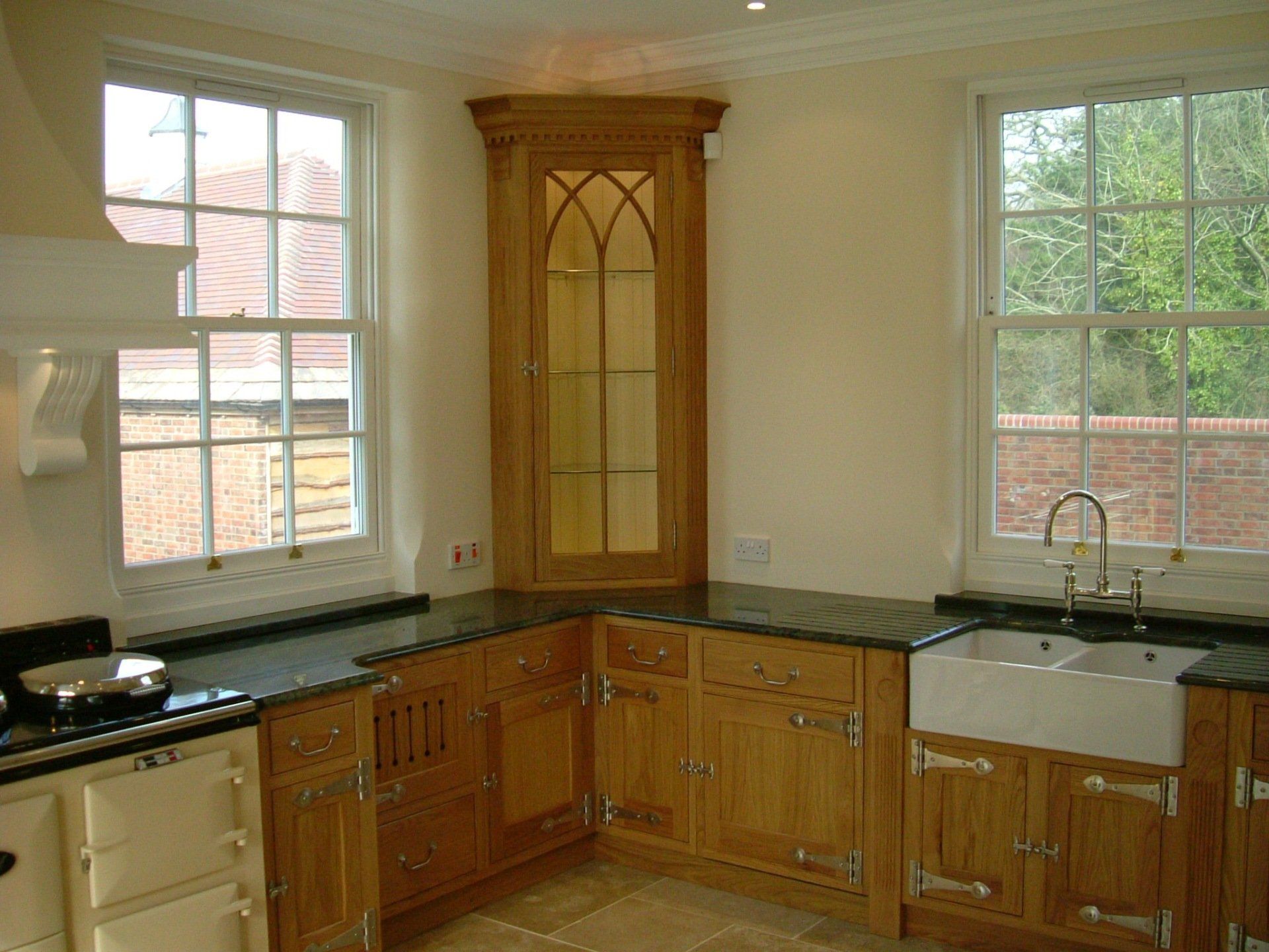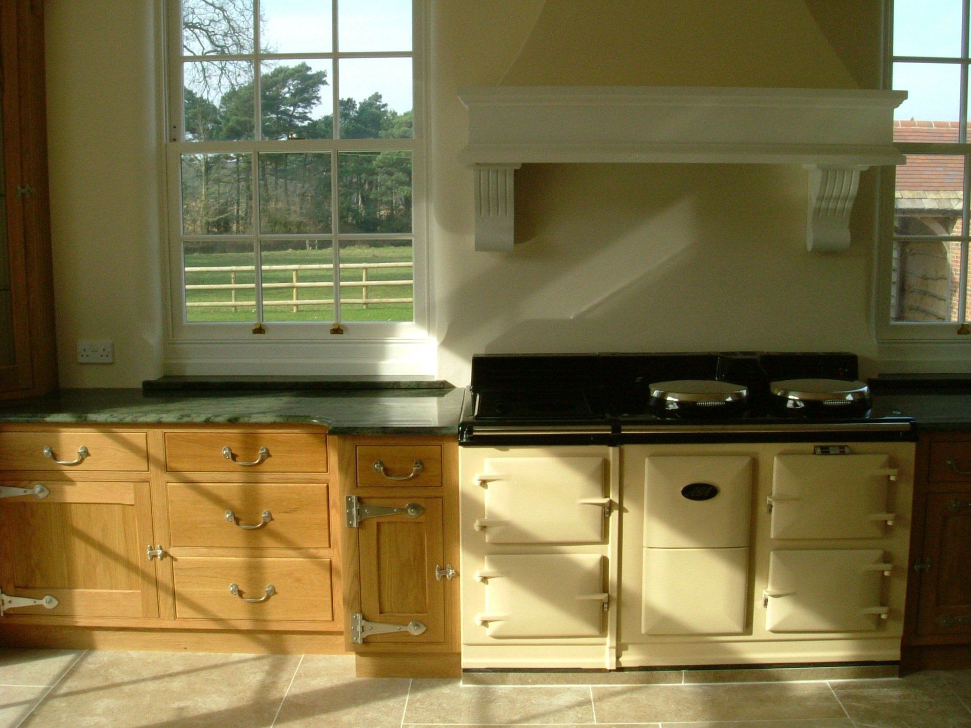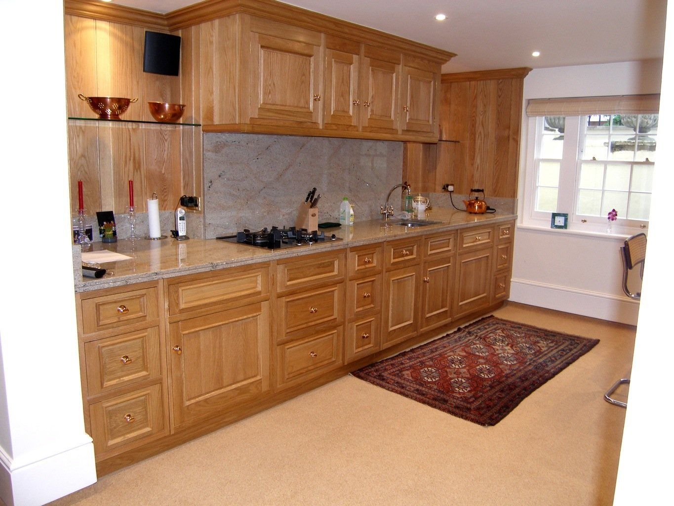 Bespoke oak kitchen displaying kitchen cupboards, doors, drawers, cornice and pelmets