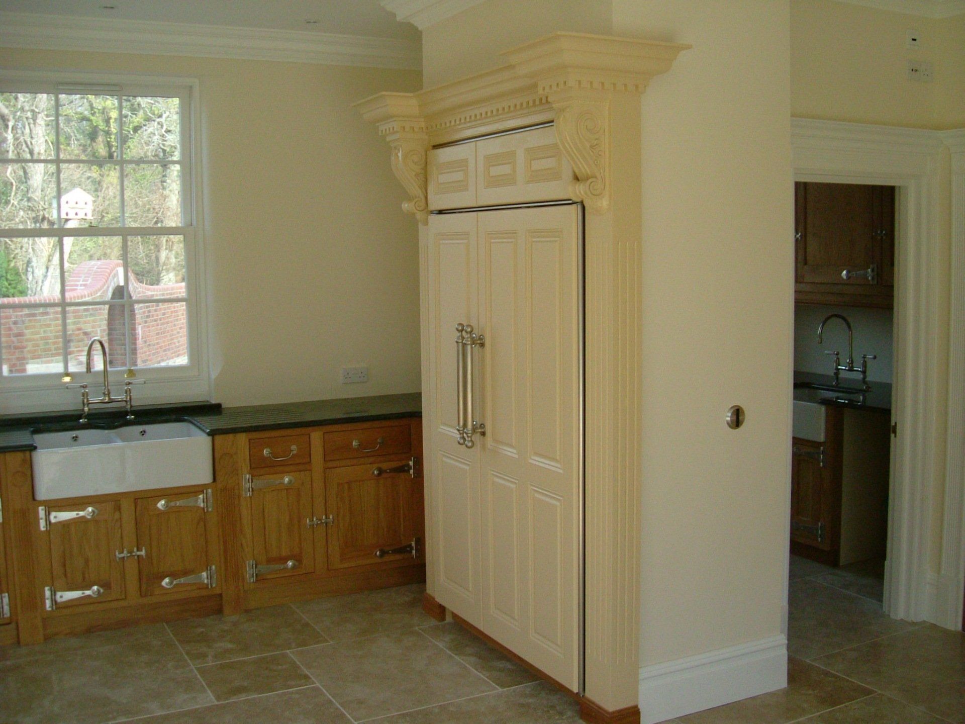 Hardwood painted bespoke Fridge Freezer doors with decorative surround and cornice