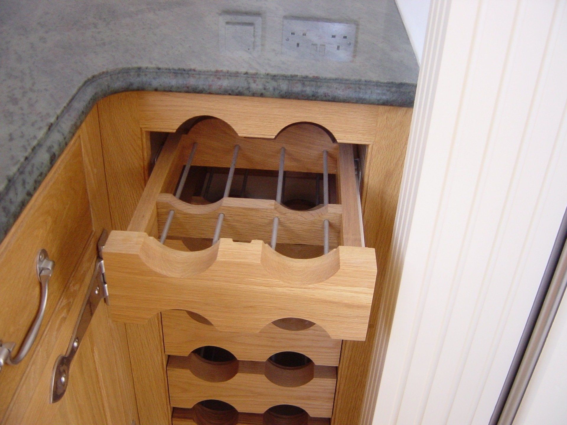 Oak wine rack made from solid oak and stainless steel bars which are on runners for ease of putting bottles in