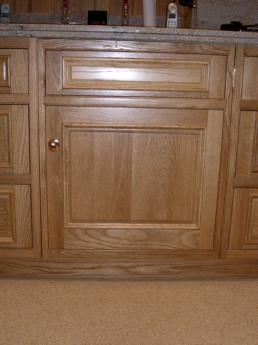 Oak kitchen door and drawer front with frame. Image showing fielded panels with bolection mould to doors and drawers