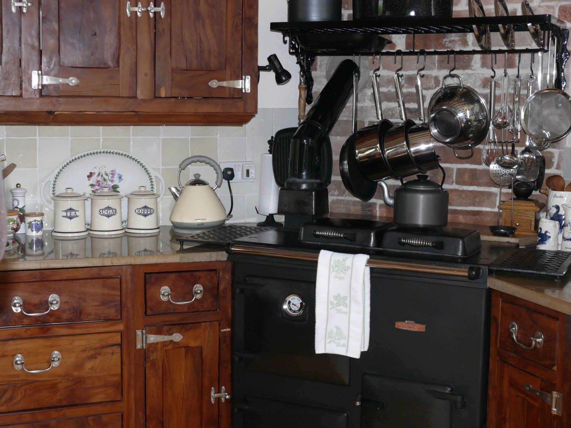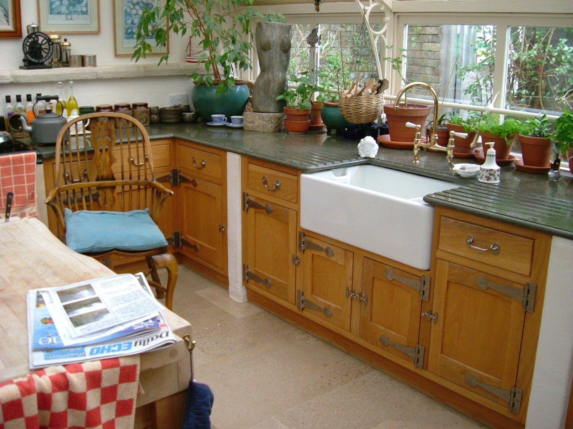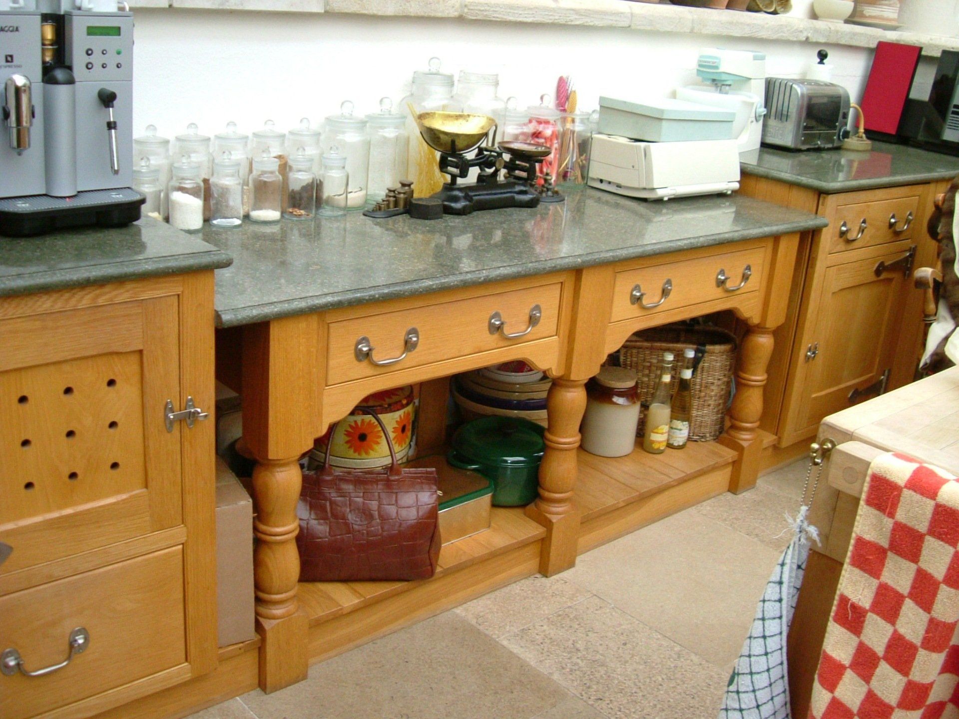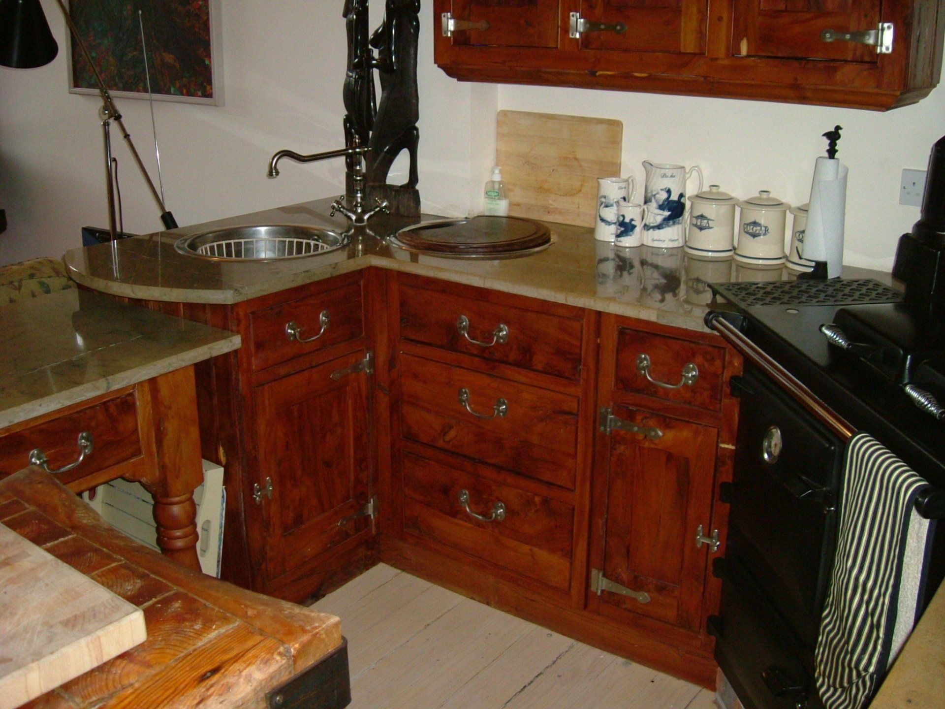 Bespoke handmade yew kitchen offering a real cottage feel. Image displaying door and drawer units