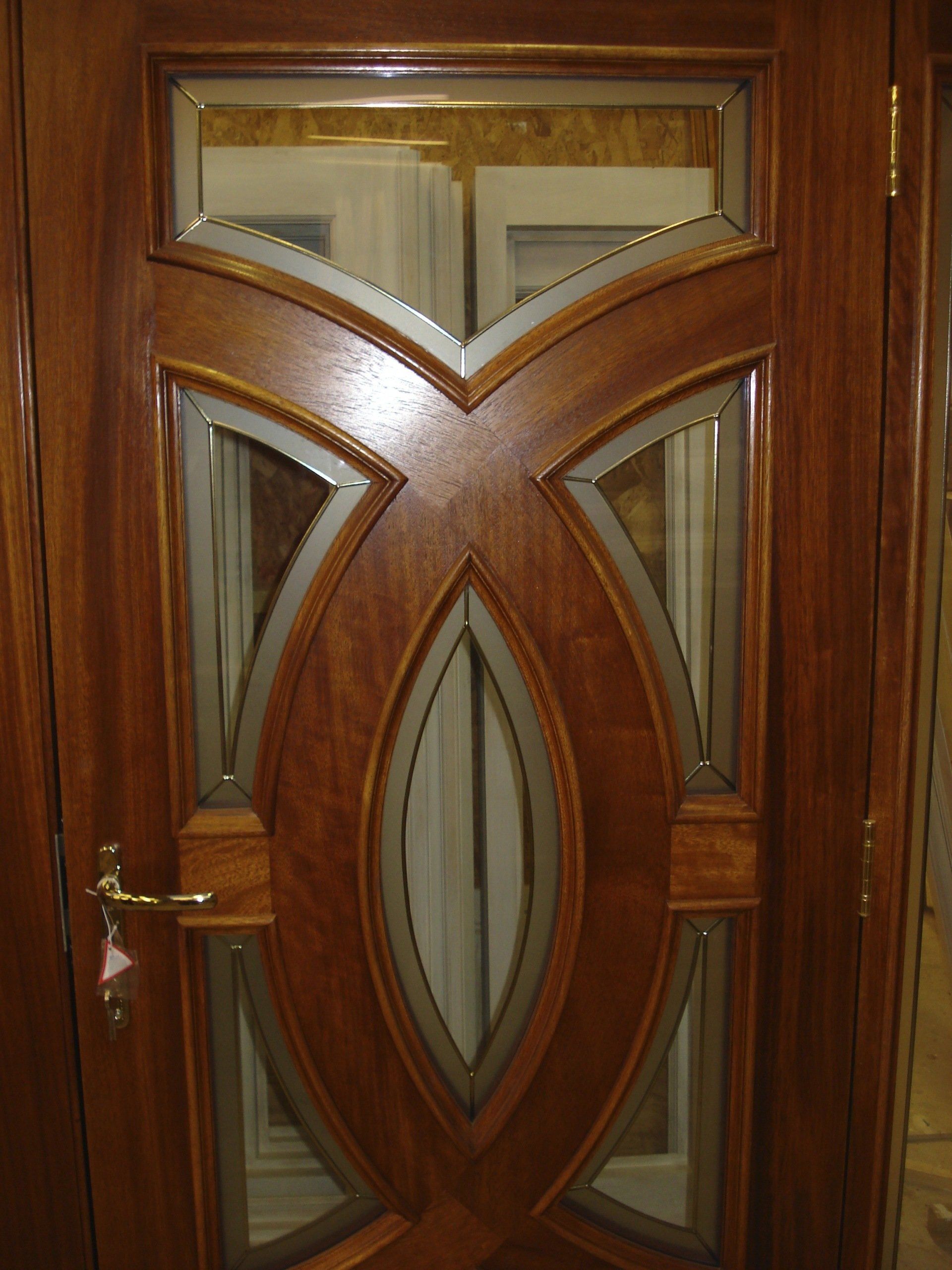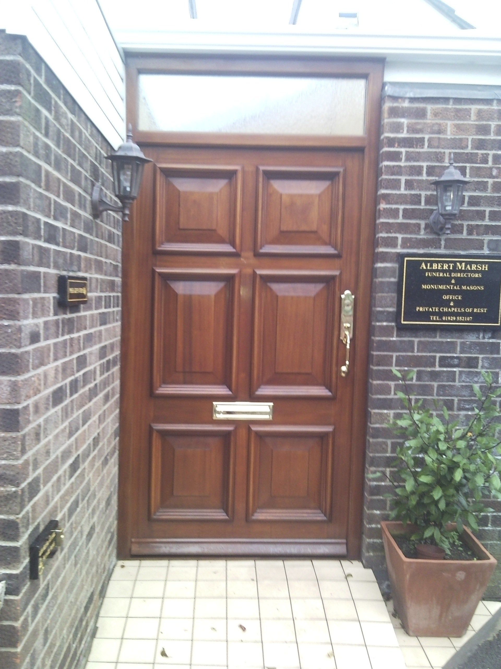 Sapele six panel Entrance door and frame with a stained finish. Frame has a double glazed unit at the top of the frame and includes polished brass ironmongery