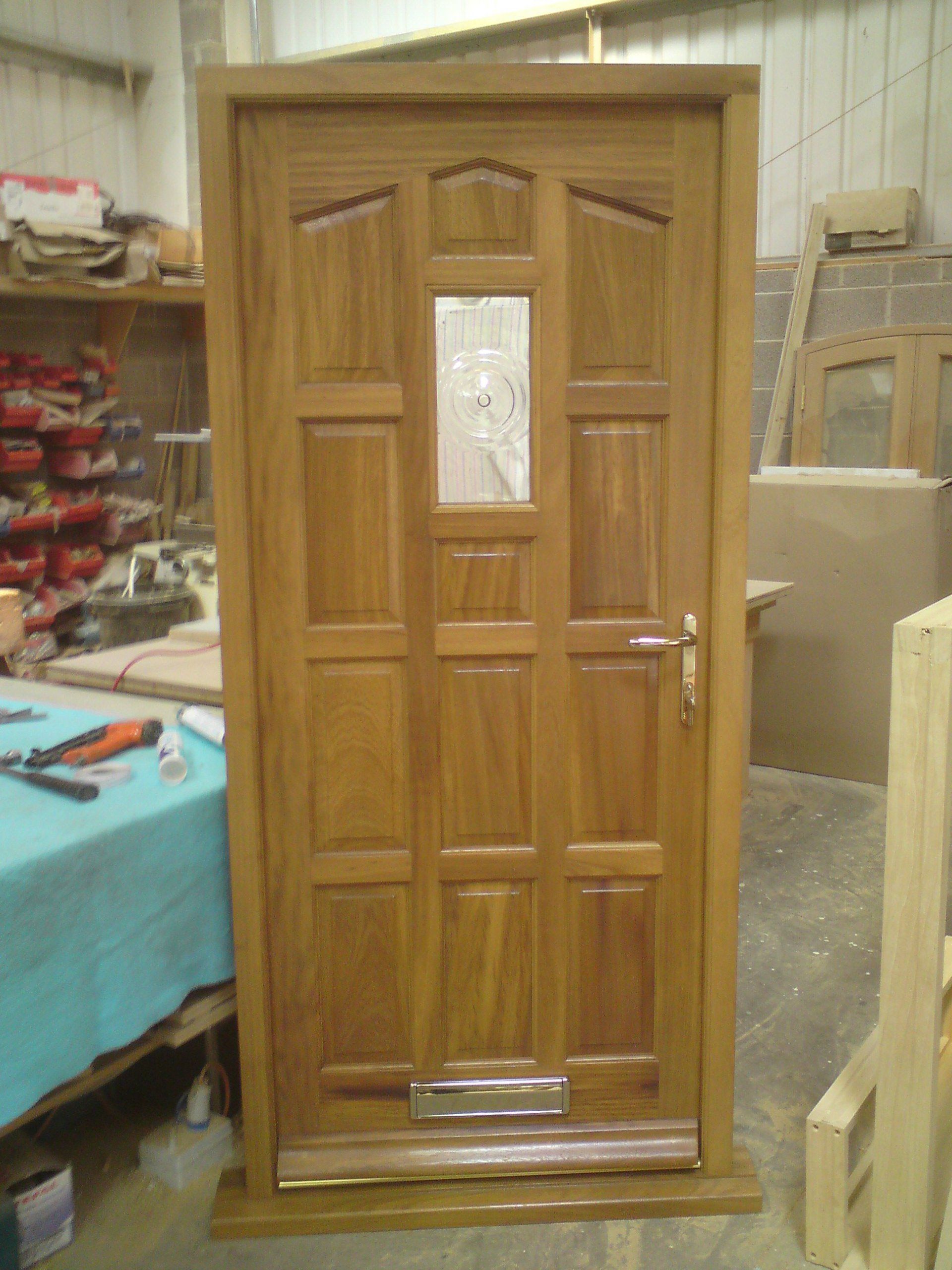 Iroko front door and frame with a stained finish. Door has fielded panels and an ovolo mould to the rails with a double glazed patterned unit