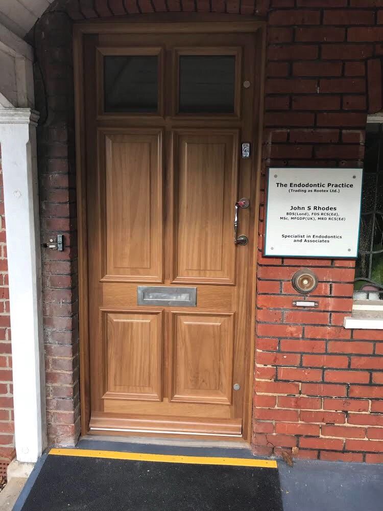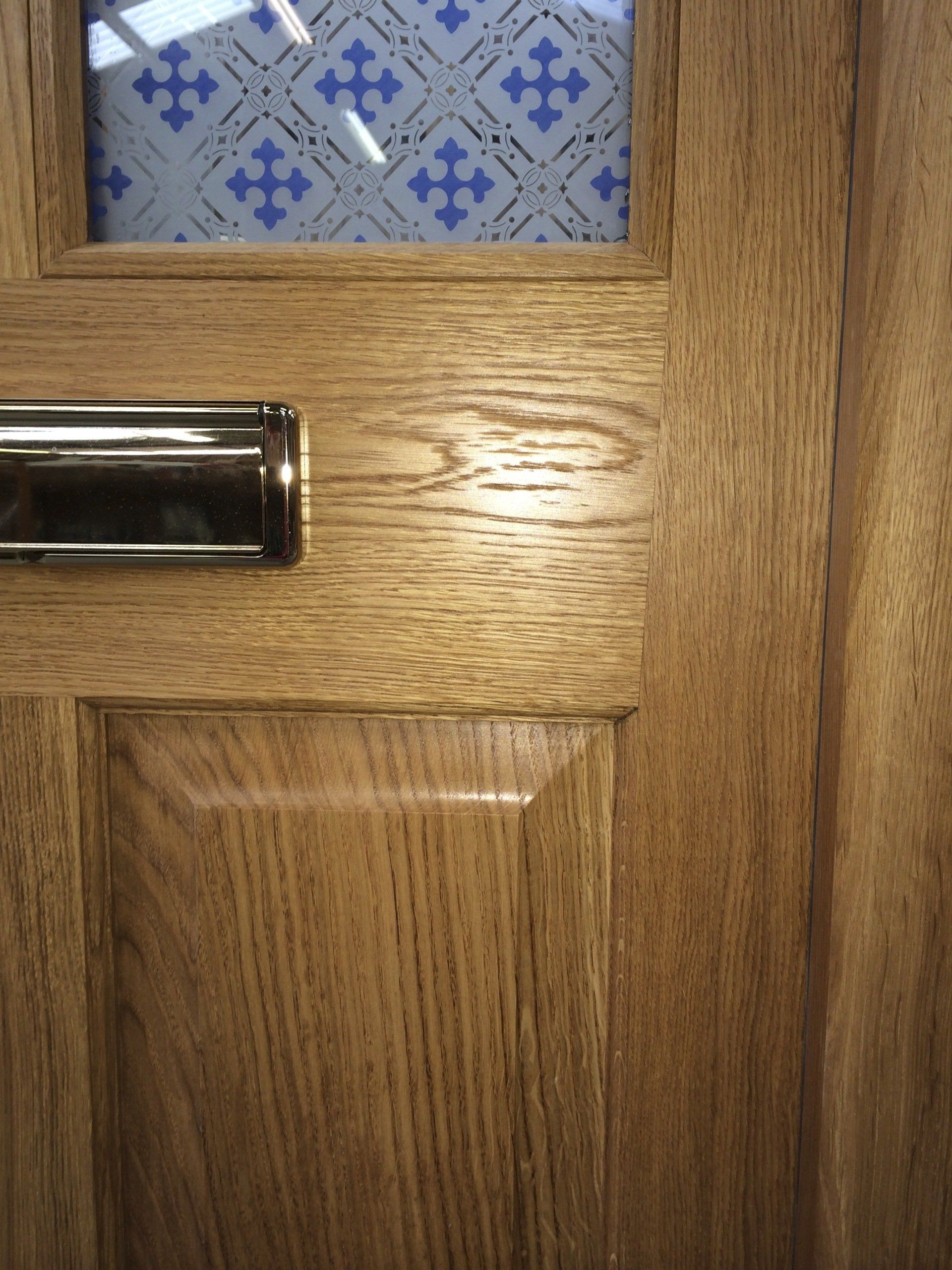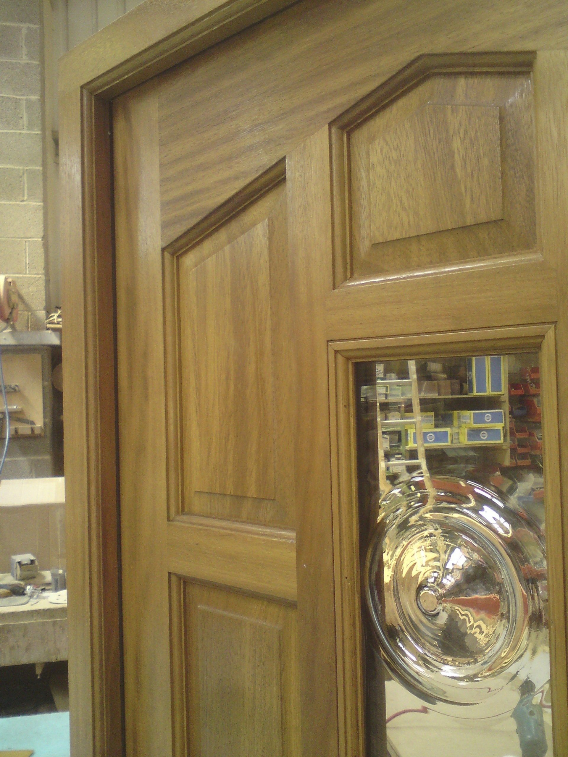 Detailing to Iroko door displaying fielded panels, ovolo mould and double glazed unit