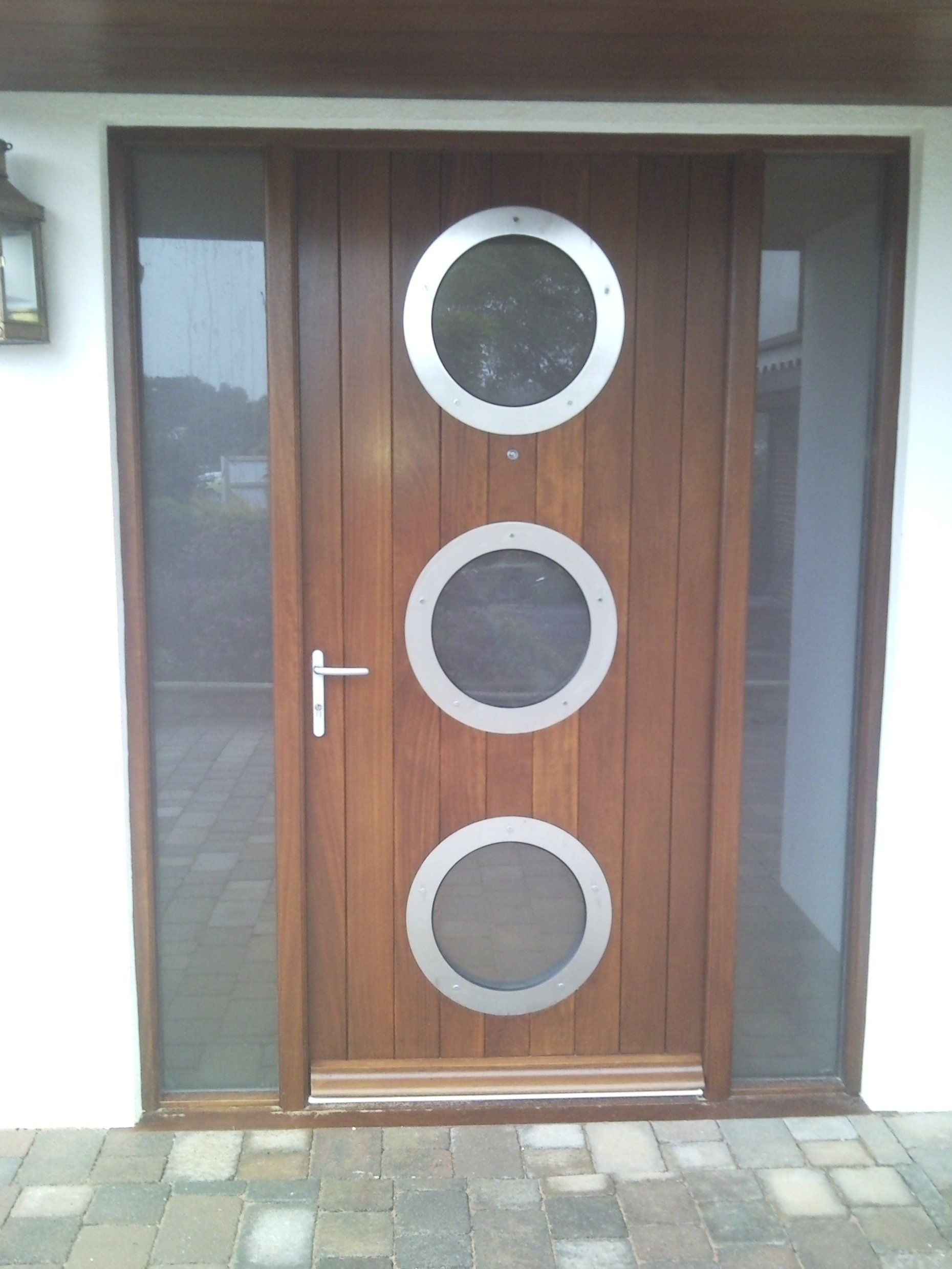 Iroko door and frame with a stained finish. Door contains v tongue and groove boarding and three round double glazed units to give a porthole effect