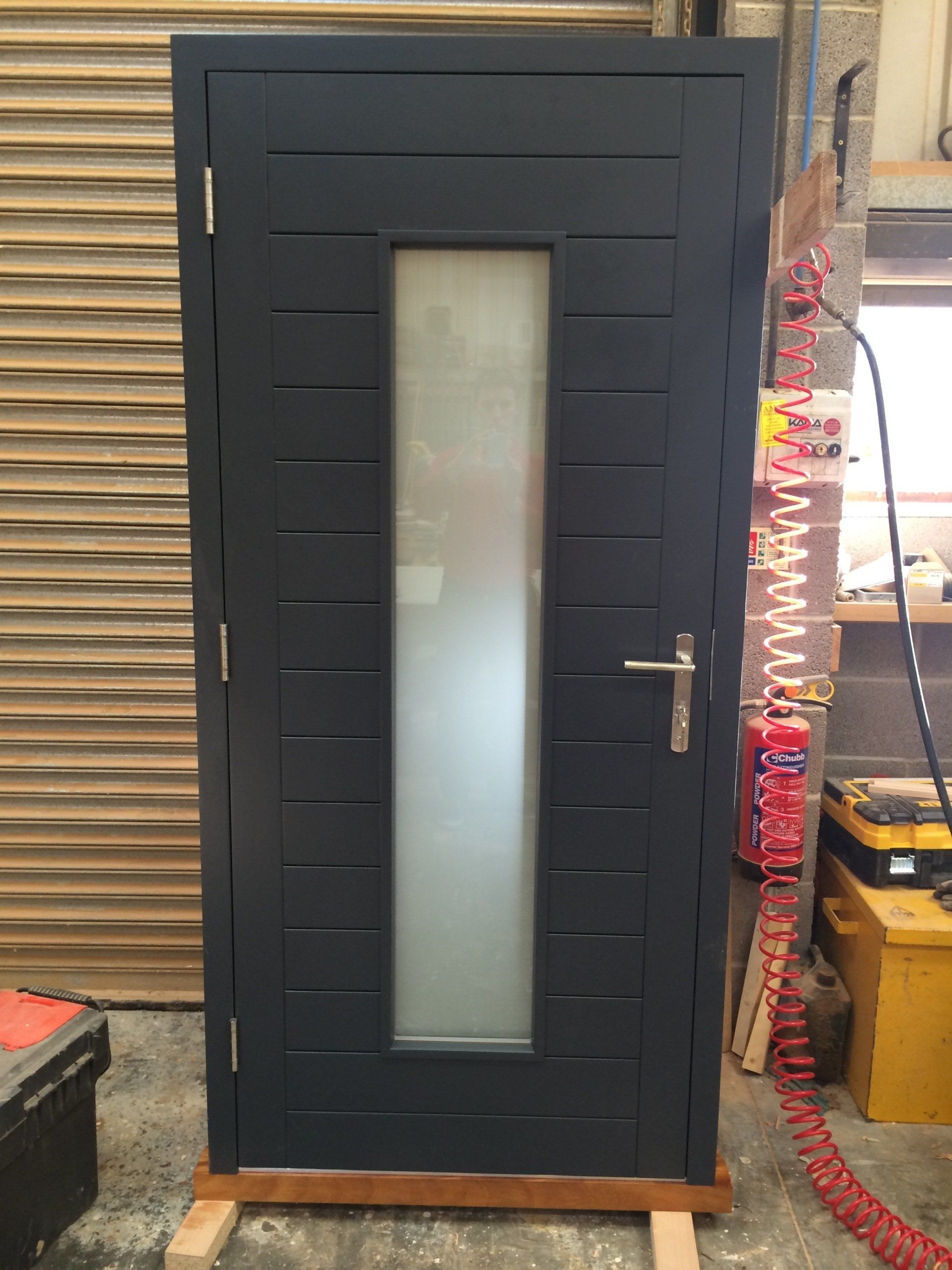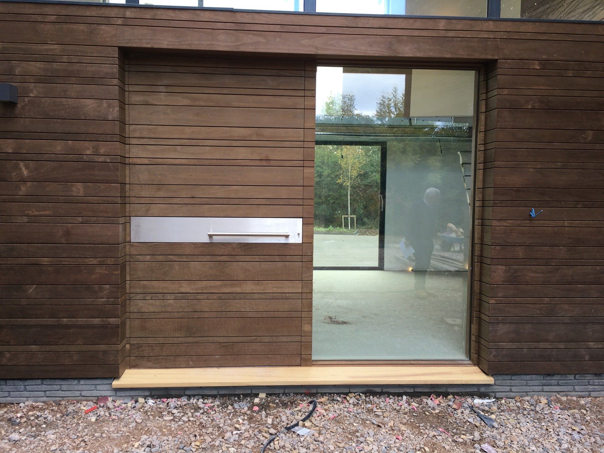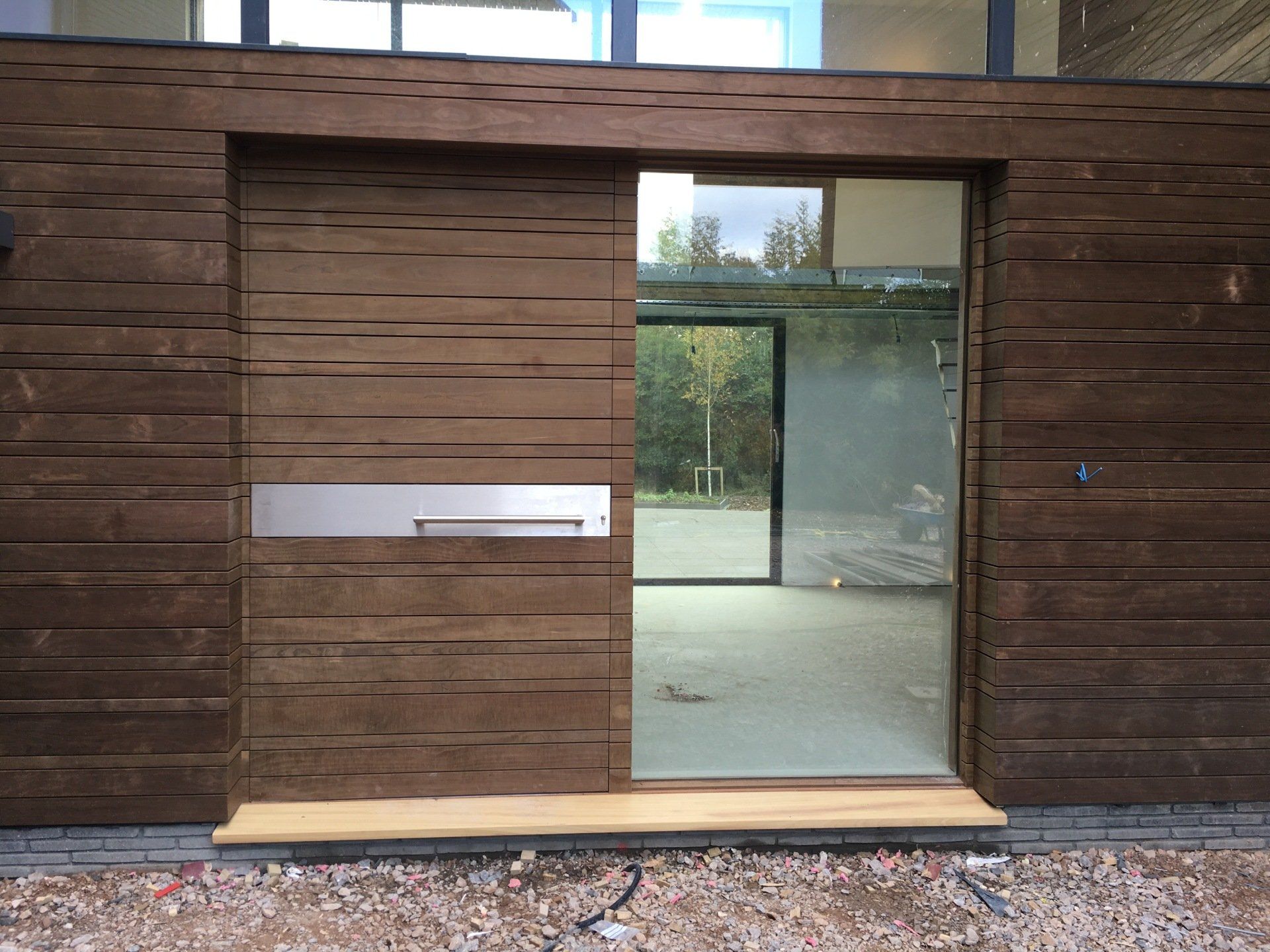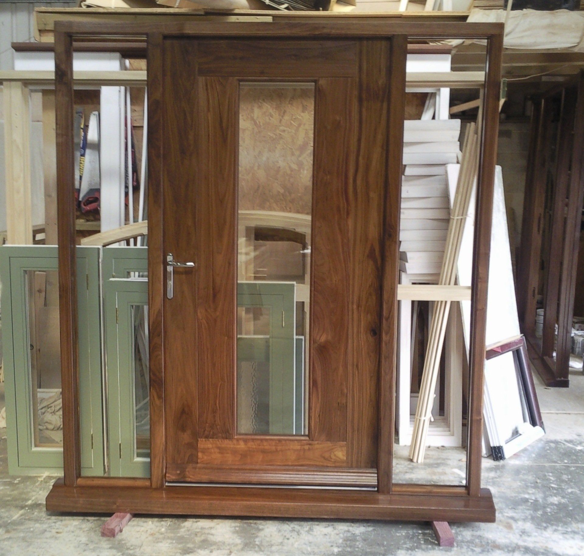 Walnut front door and frame offering a modern contemporary look. Door is solid with a v joint moulding and double glazing to door and frame