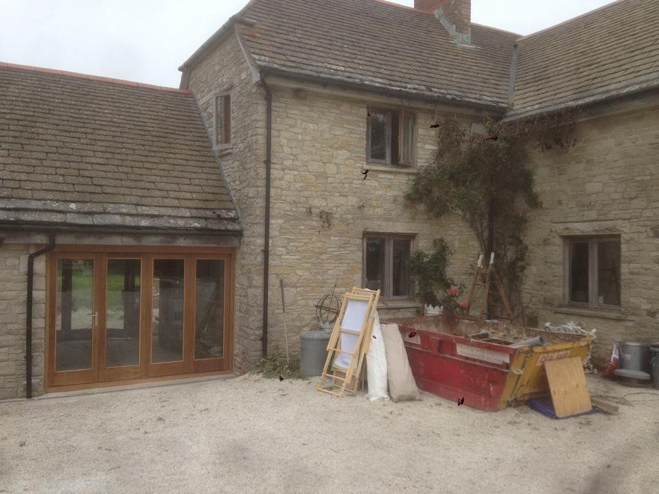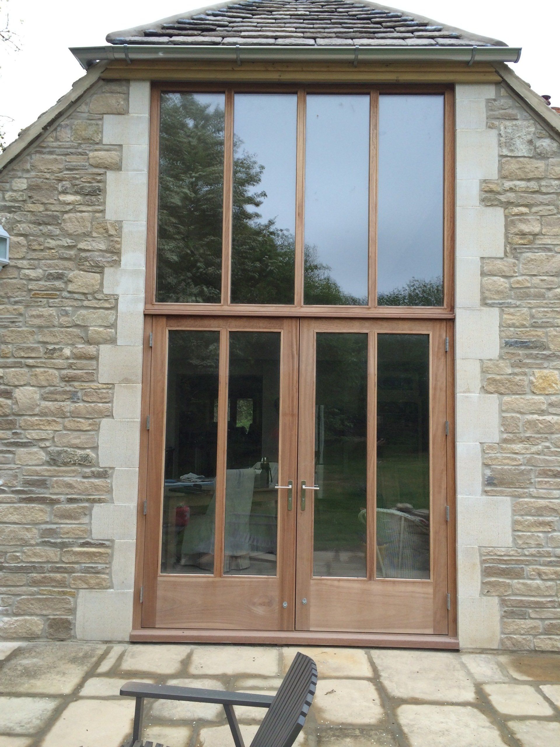 Iroko Stained double entrance doors with glazed sidelights. Doors include espagnolette locking with patterned double glazed units