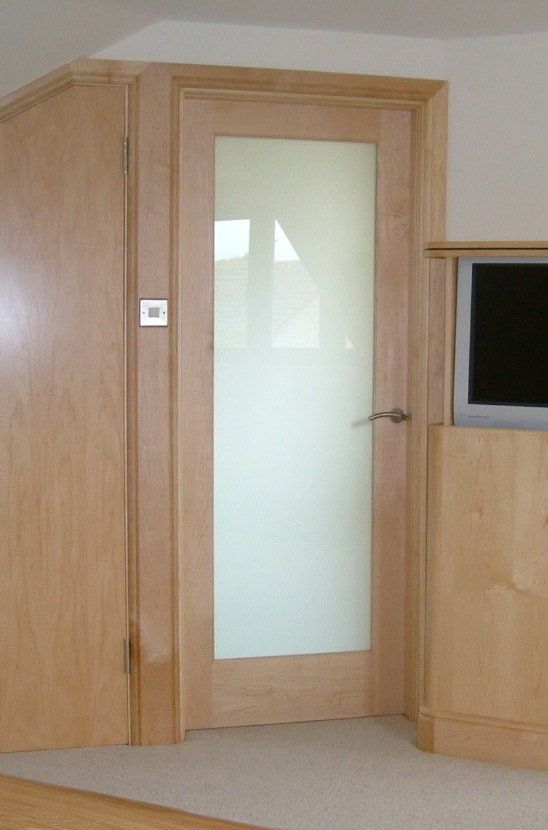 Contemporary solid maple interior door with white laminate glazed unit