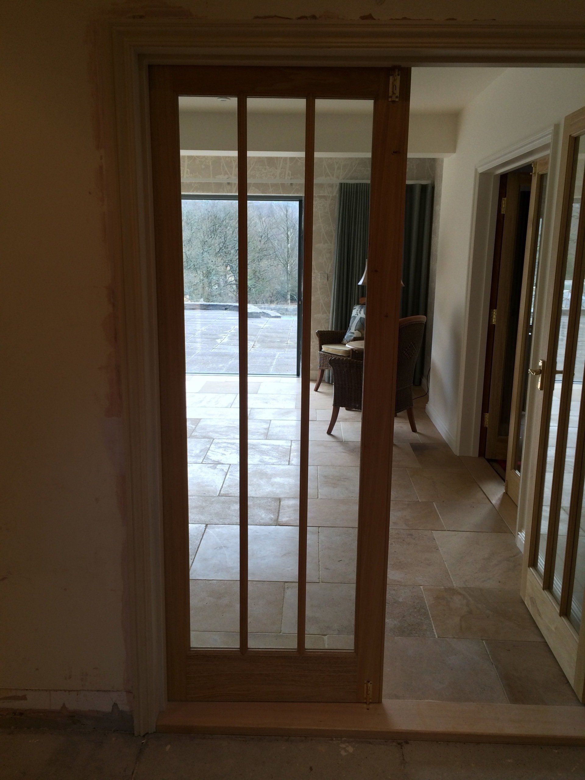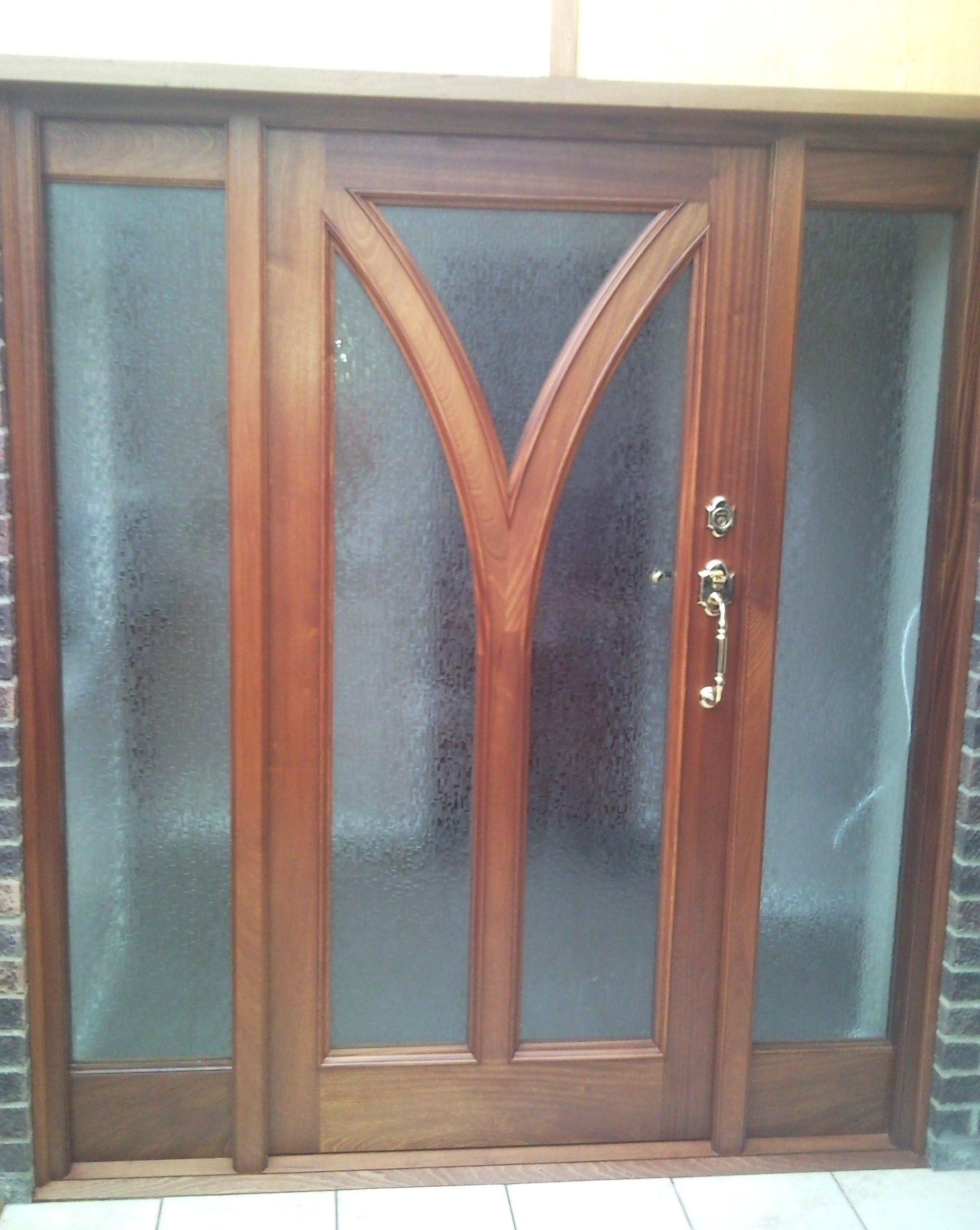 Sapele interior door and frame. The door has a striking wishbone effect with bolection moulding to door and frame