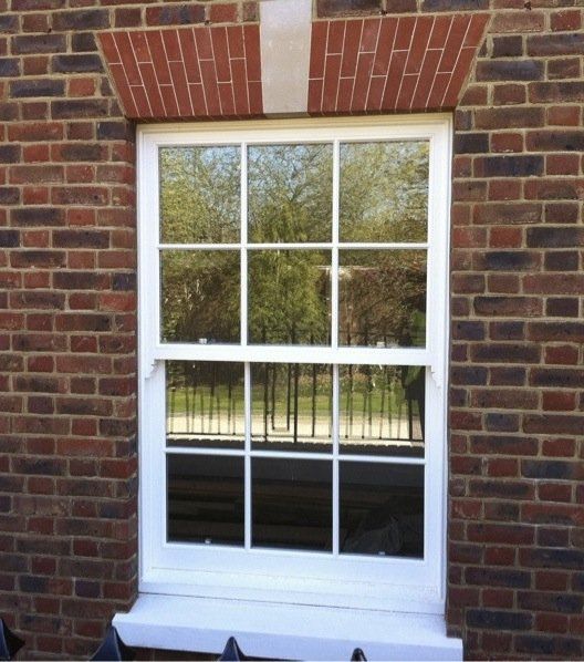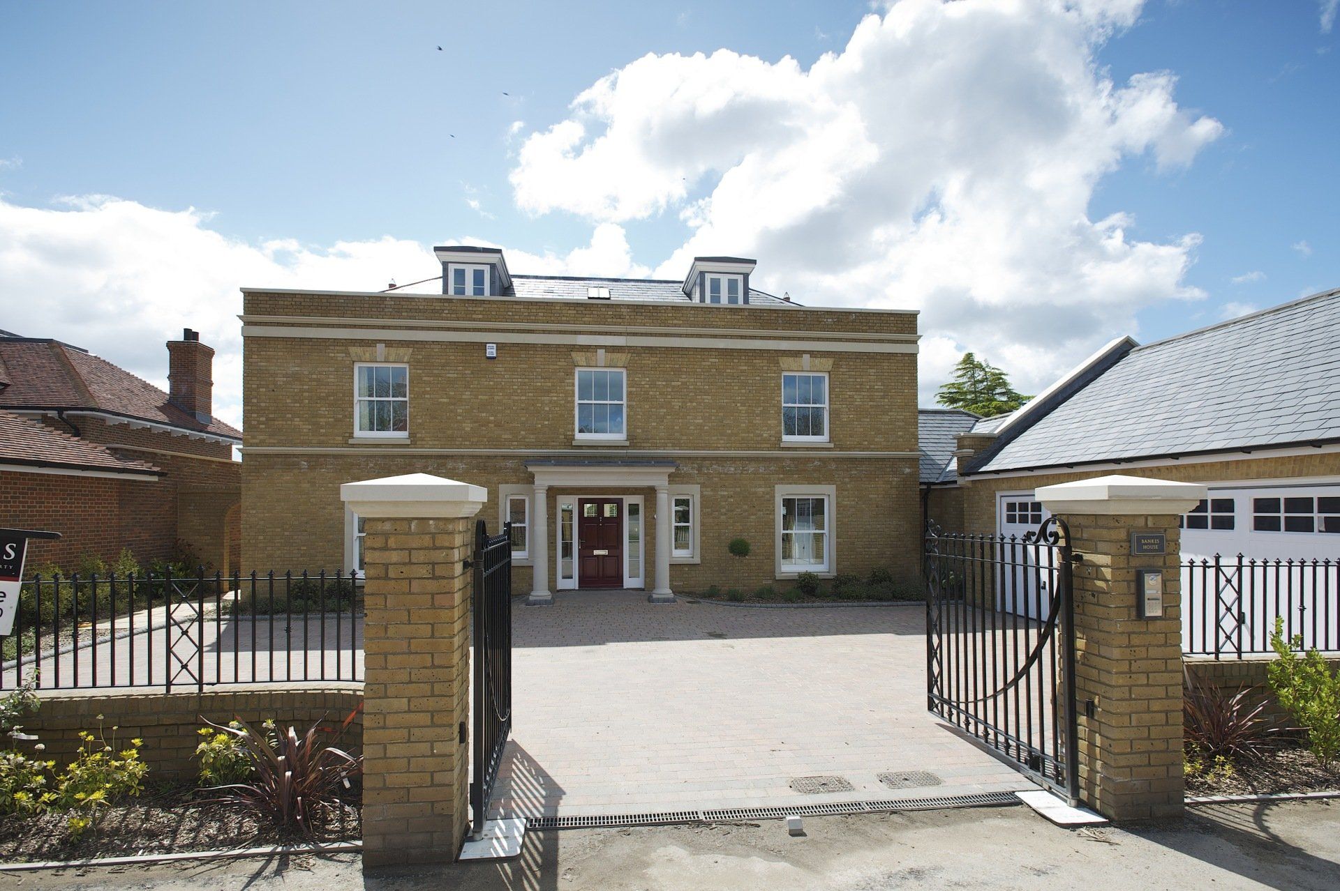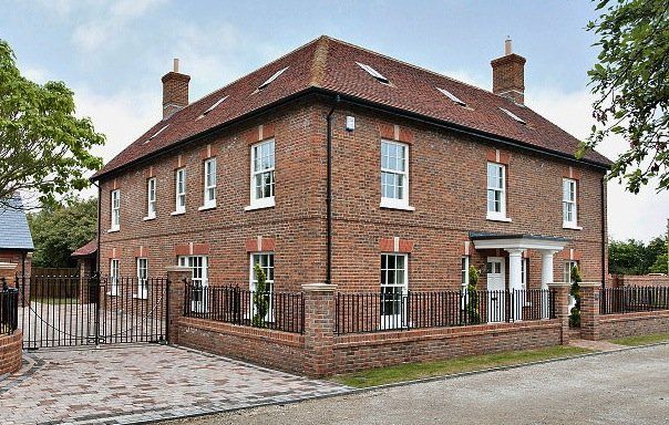 Finished House at Worgret gardens in Wareham. The image shows beautifully our sliding sash windows we constructed for this build. Also shown in this picture are two casement fire escape windows which are in the roof