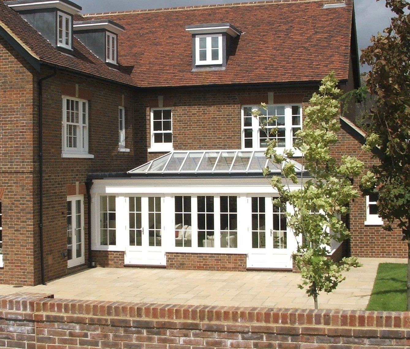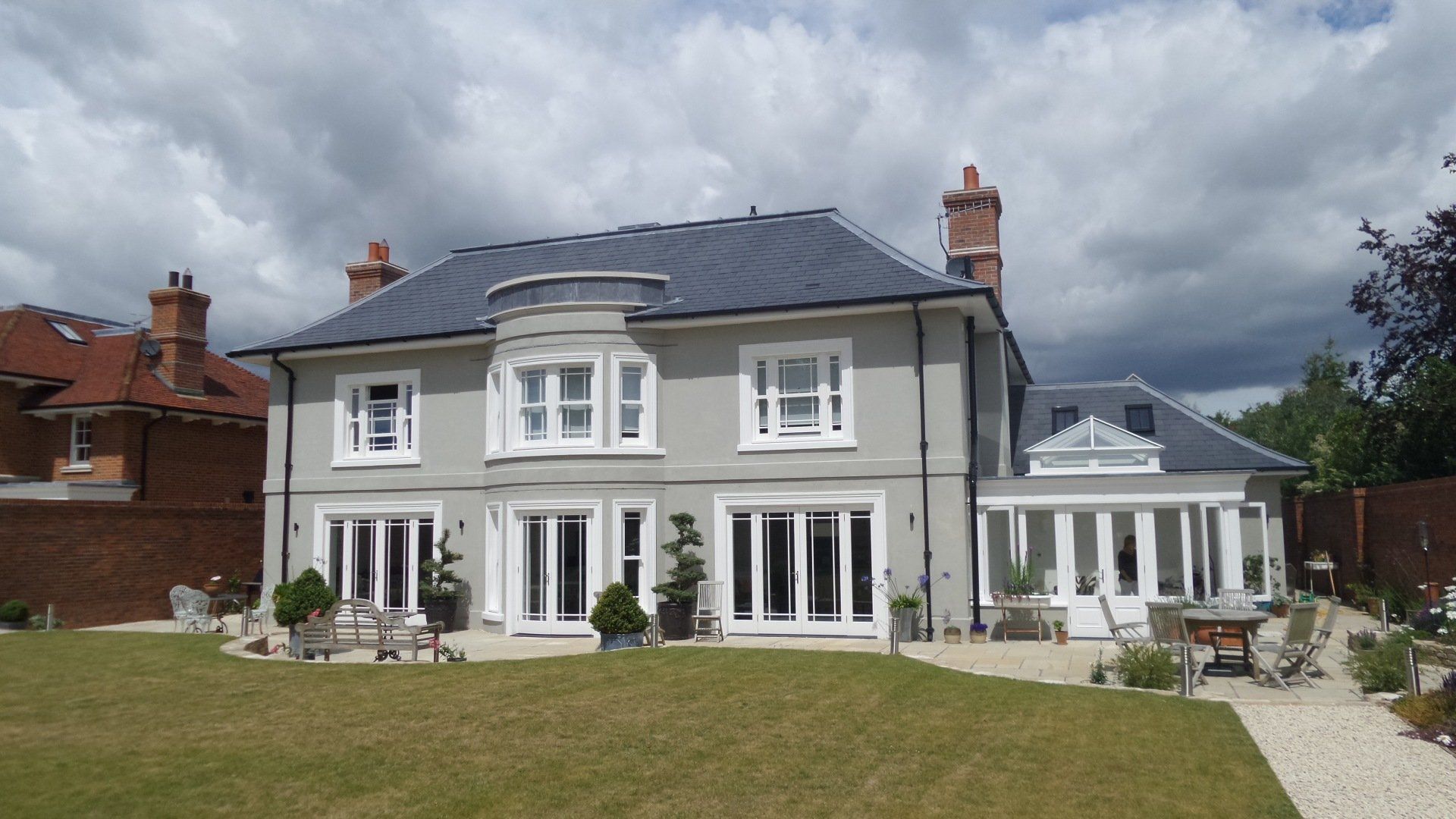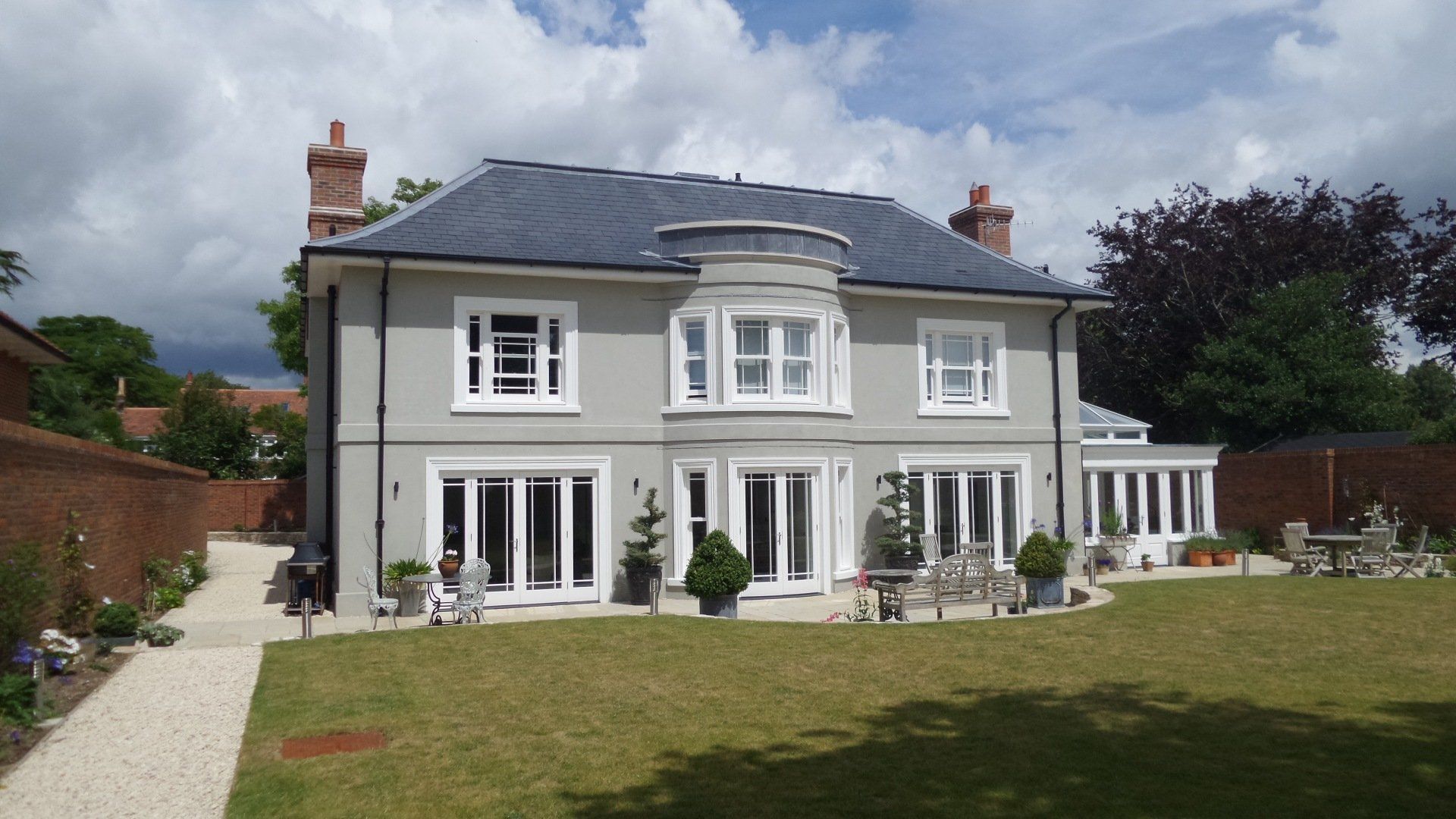 Finished House at Worgret gardens in Wareham. The image shows beautifully our sliding sash windows and orangery we constructed for this build. Also shown in this picture are three casement fire escape windows which are in the roof