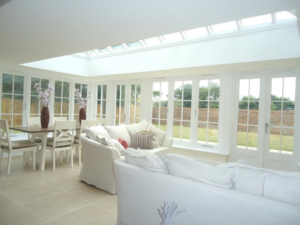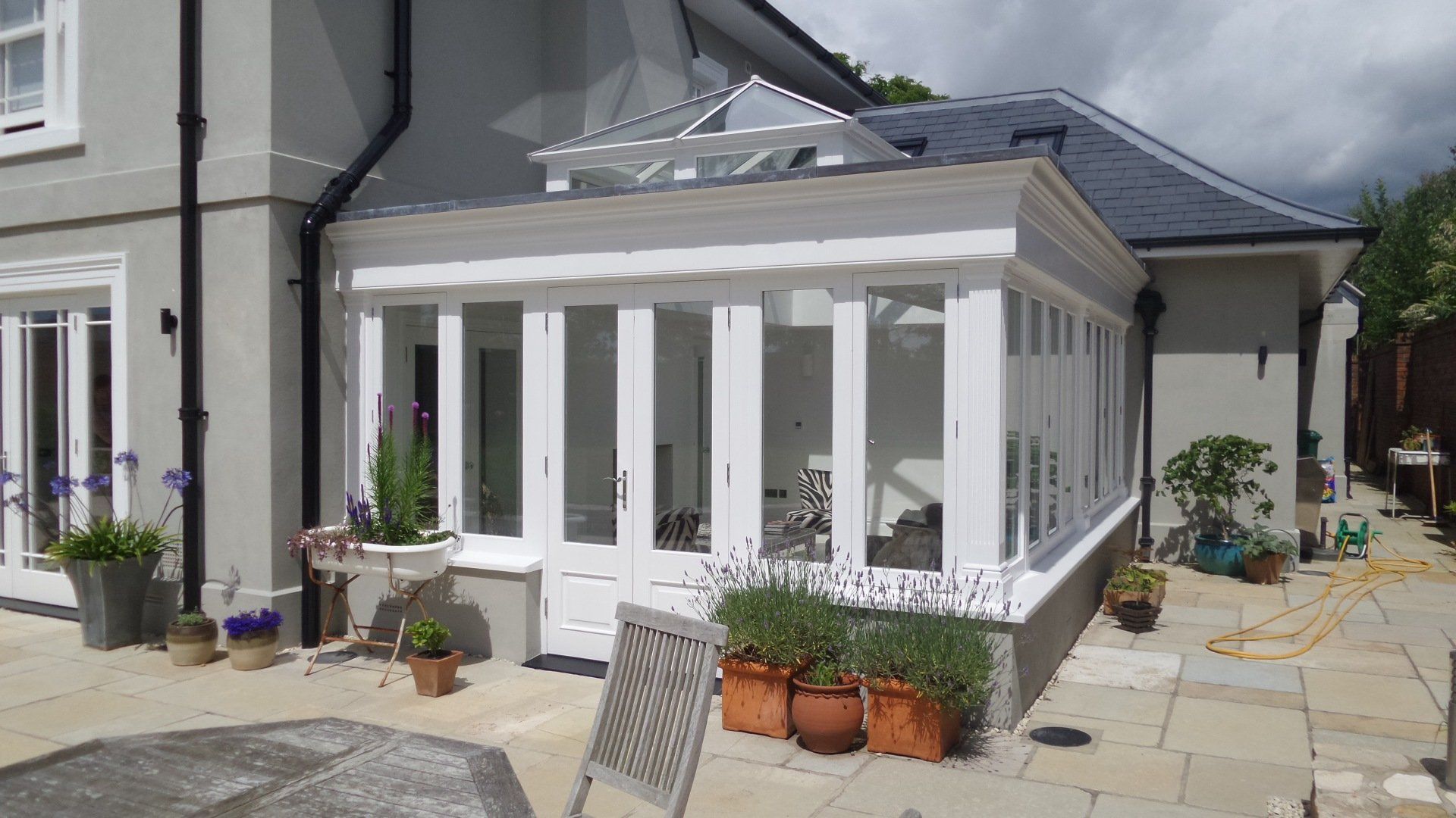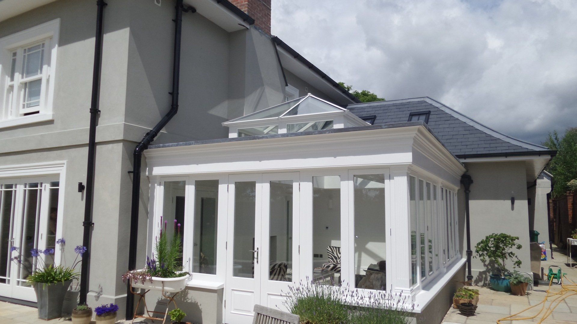 Finished House at Worgret gardens in Wareham. The image shows beautifully our sliding sash windows and orangery we constructed for this build. Also shown in this picture are three casement fire escape windows which are in the roof
