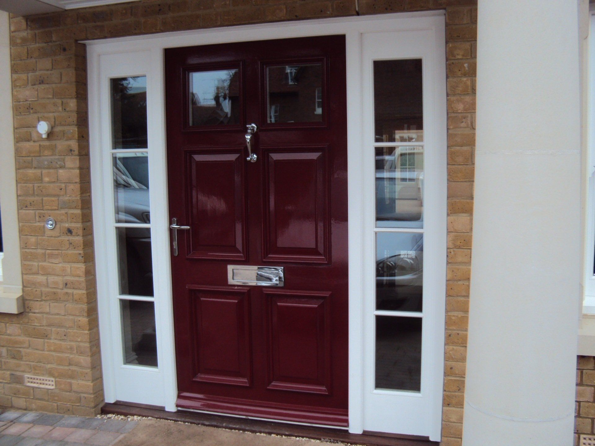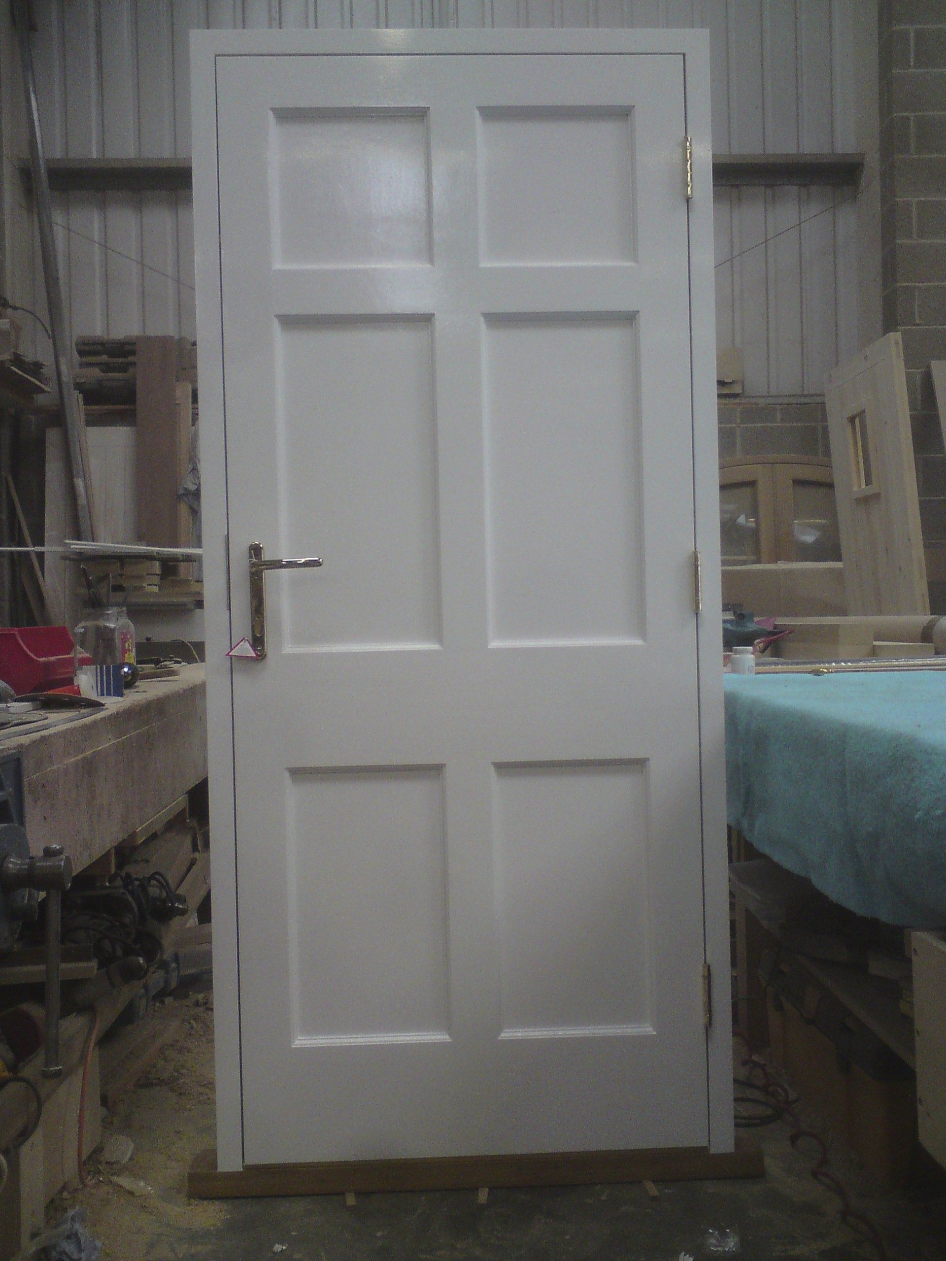 Four panel exterior front door with glazed units at top with bolection moulding to rails. Door has a spray painted satin finish with brass ironmongery and espagnolette locking