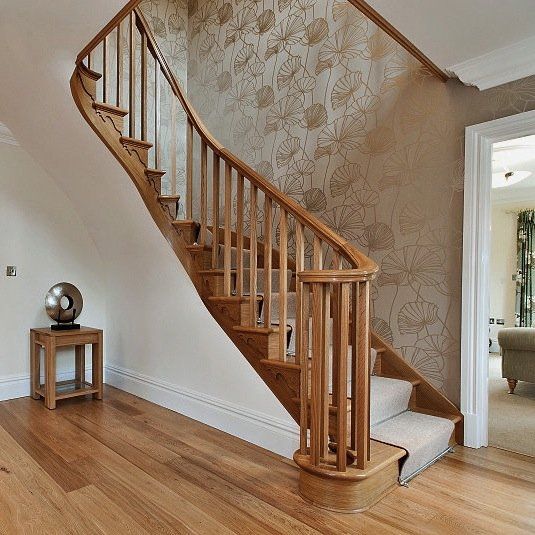 Bespoke oak quarter turn cut string staircase with continuously flowing handrail. Includes a curtail step with square spindles with a moulded handrail