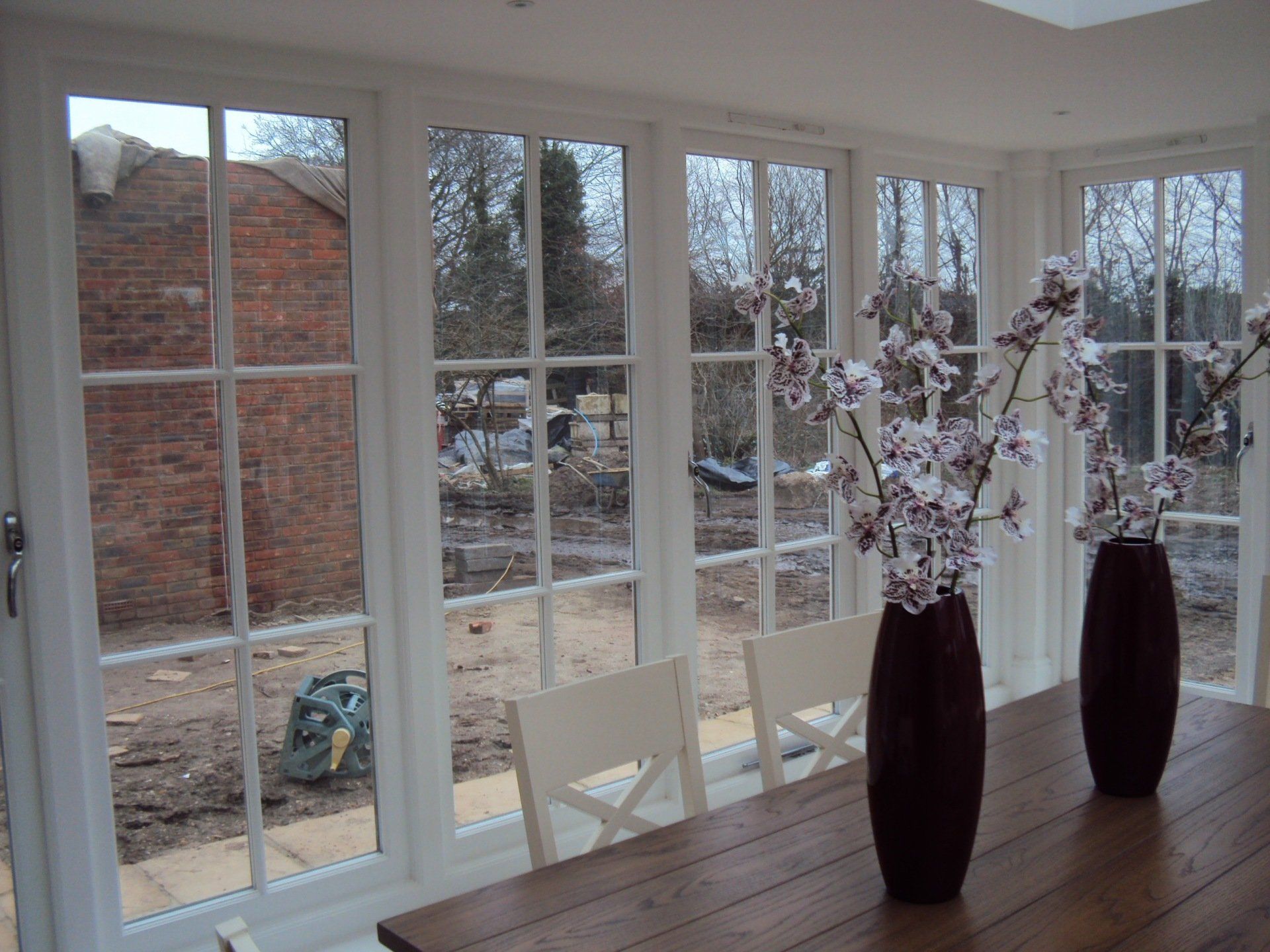 Orangery interior displaying hardwood windows with a ovolo moulding, polished chrome ironmongery