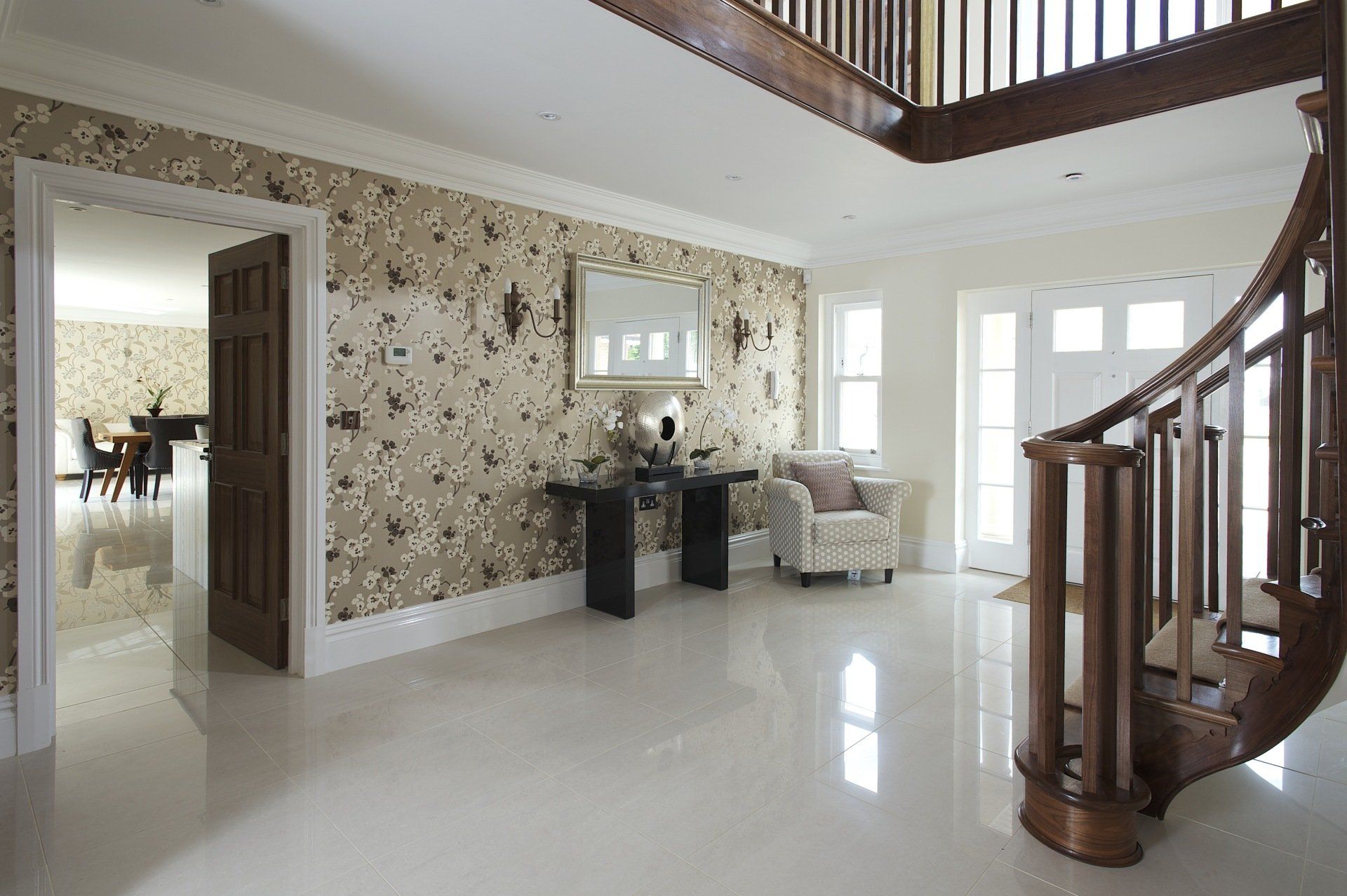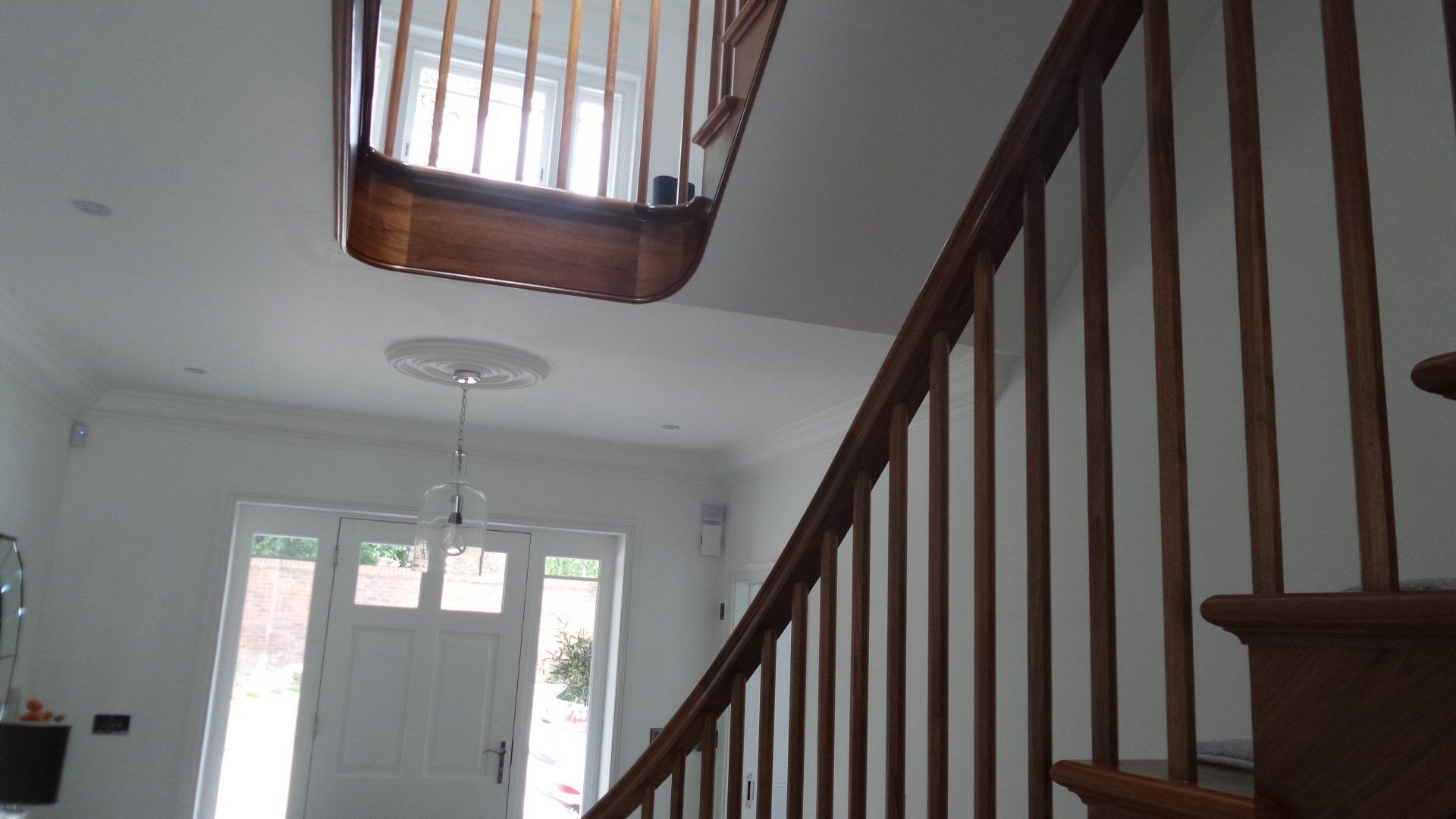 Image showing a few items of interior joinery we supplied for worgret gardens in Wareham. The items include skirting, architrave and an elegant walnut staircase. Also shown are the front door and sliding sash window we supplied.