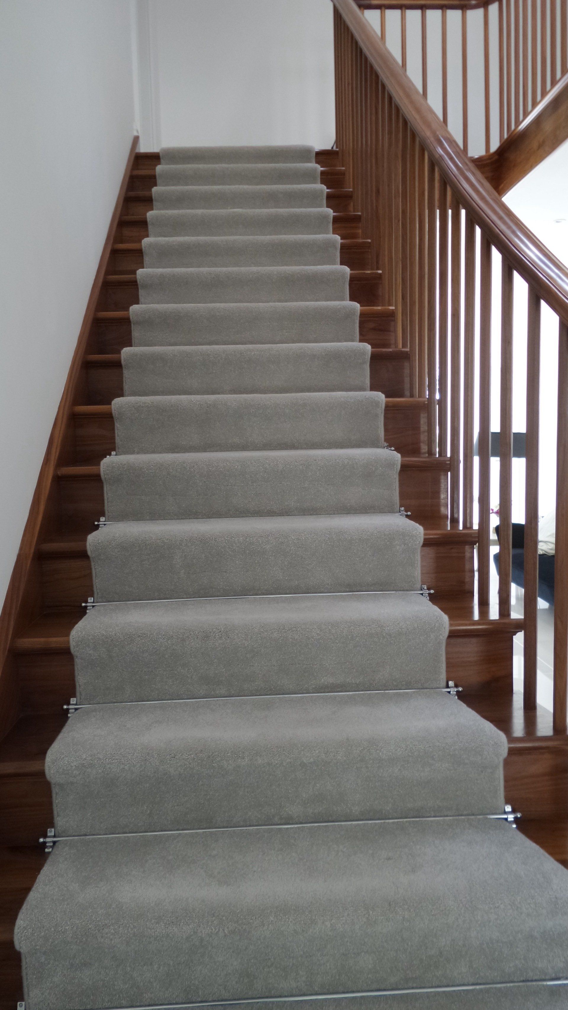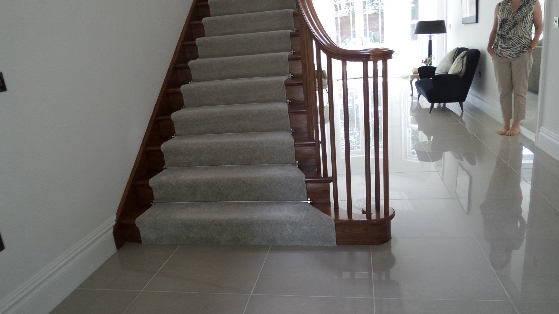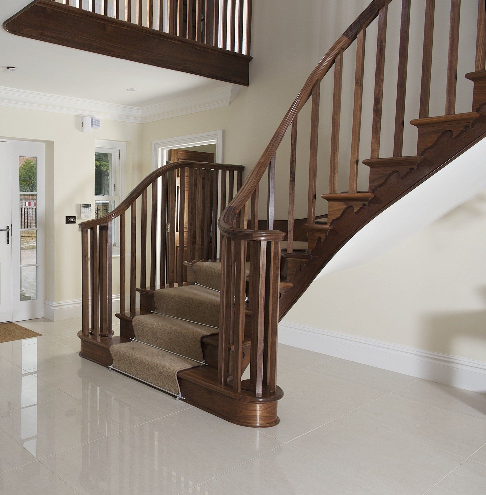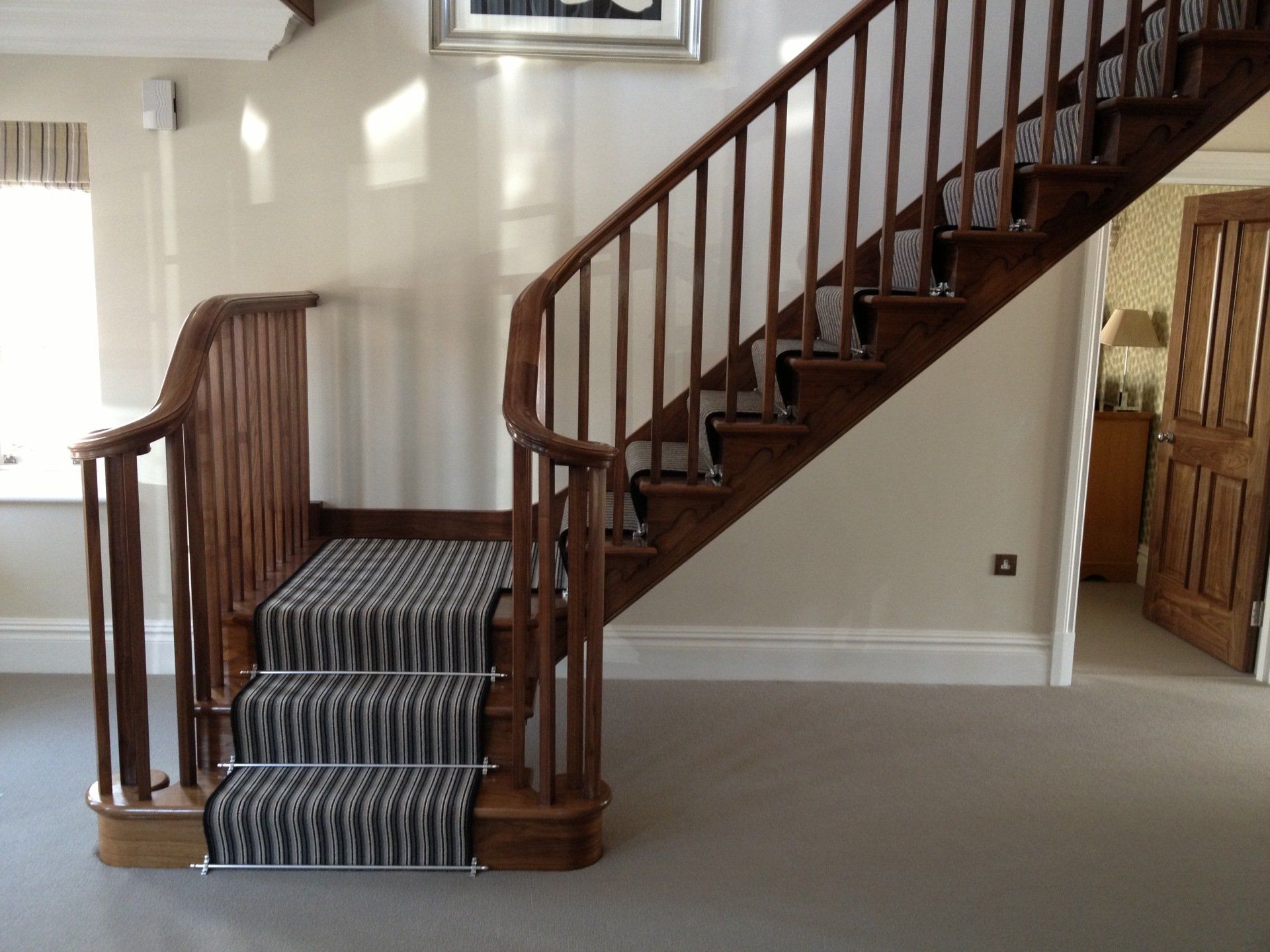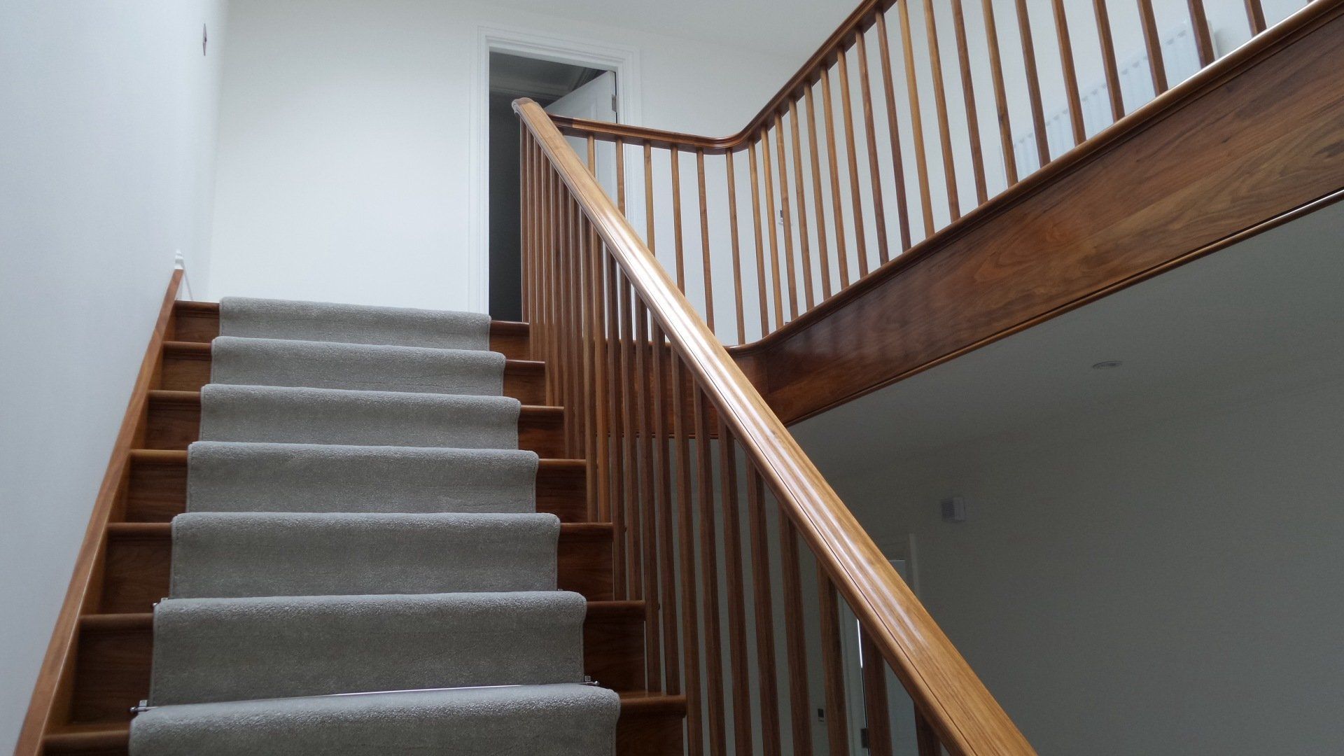 Walnut quarter turn cut string staircase. Handrail flows continuously from the curtail detail at the bottom to the top where it runs into the wall. Stairs are all solid timber and have meticulous detail
