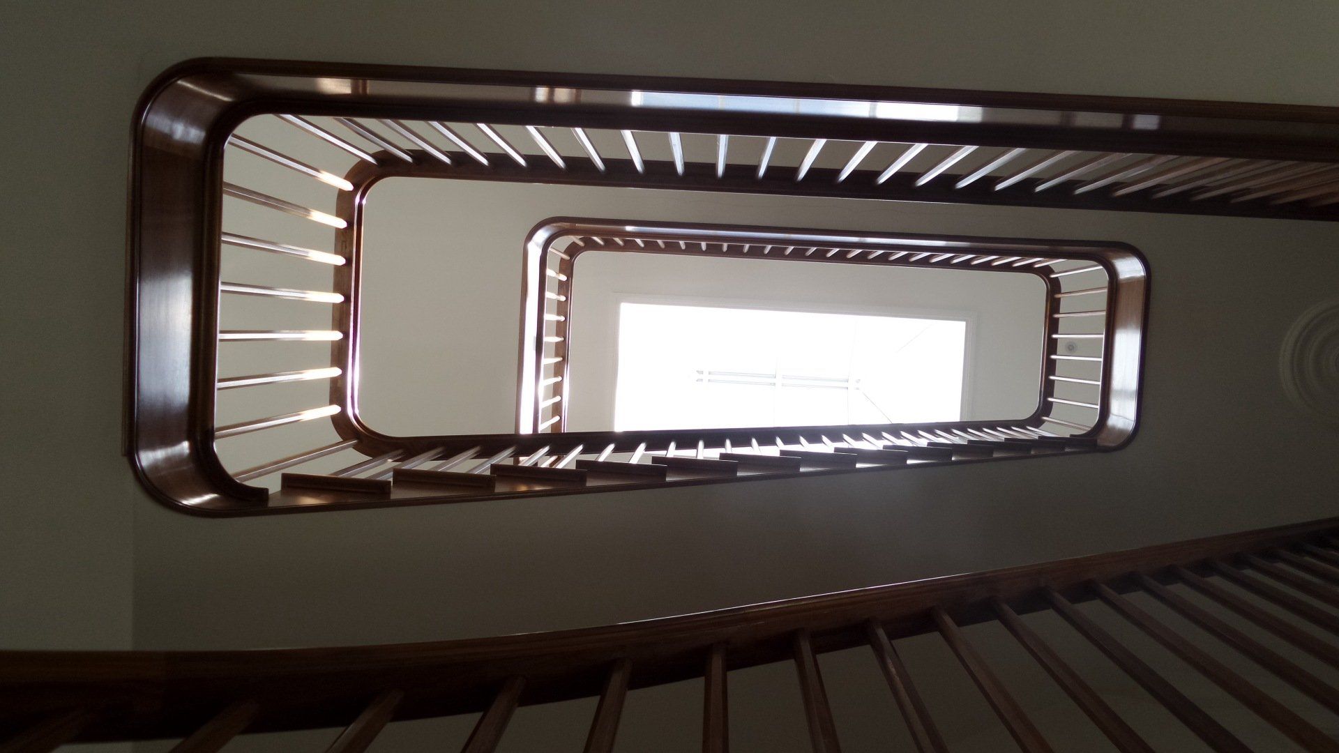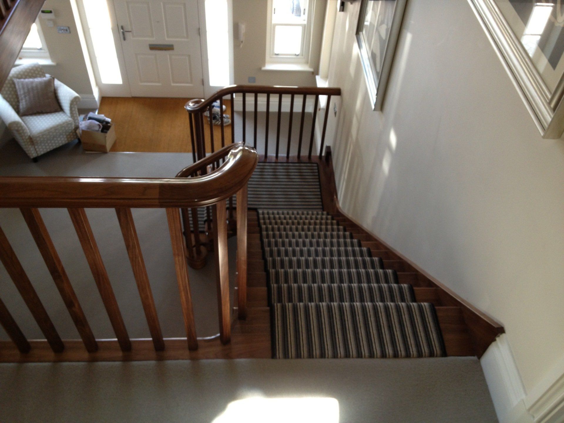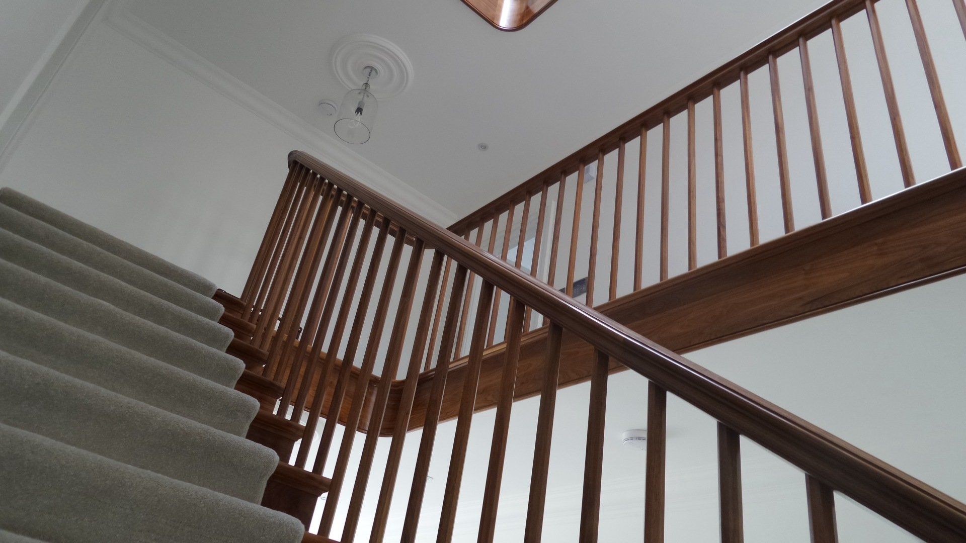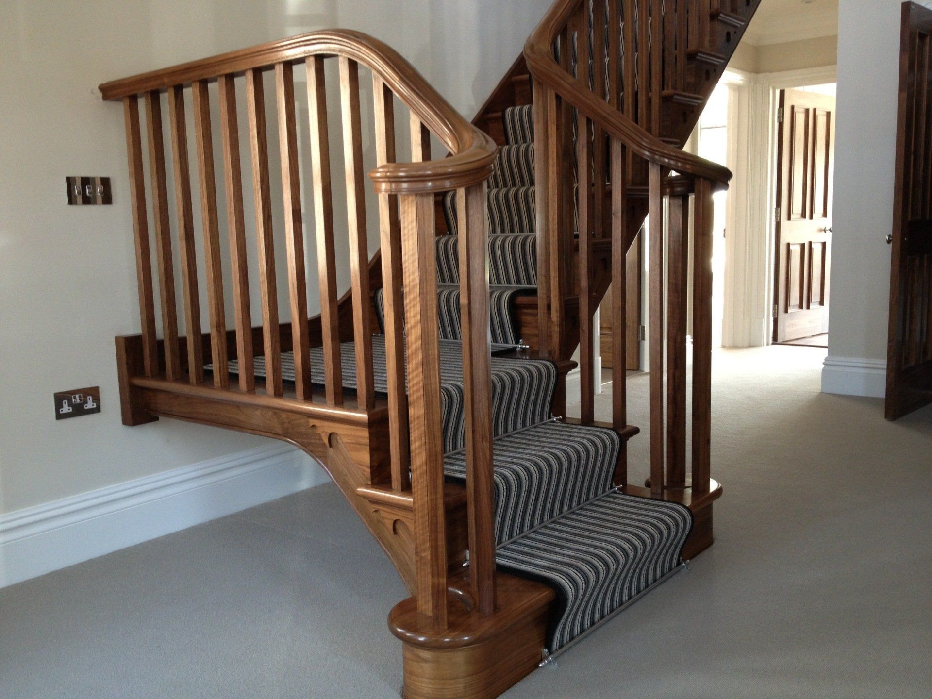 Walnut quarter turn cut string staircase with winders. Handrail flows continuously from the curtail detail at the bottom to the top where it runs into the wall. Stairs are all solid timber and have meticulous detail
