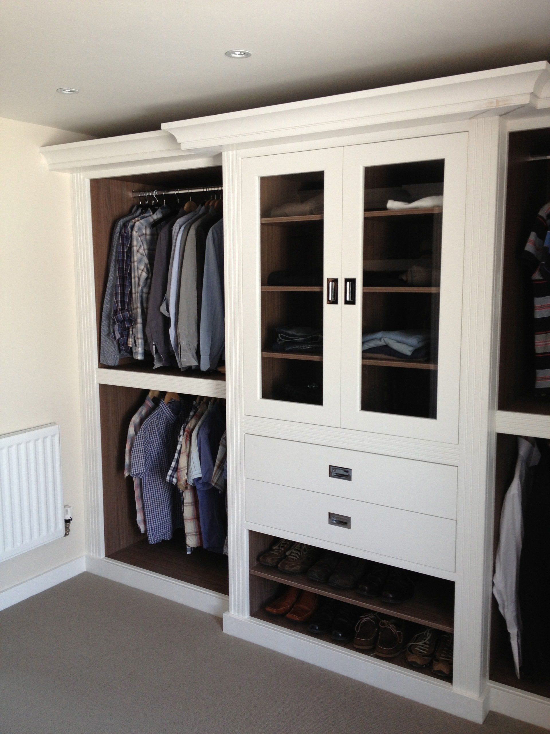Walnut faced fitted wardrobes with painted framing, doors and drawers to front. Complete with cornice moulding and moulded pillars to offer a visually appealing appearance